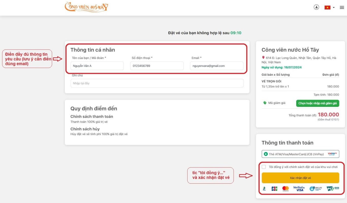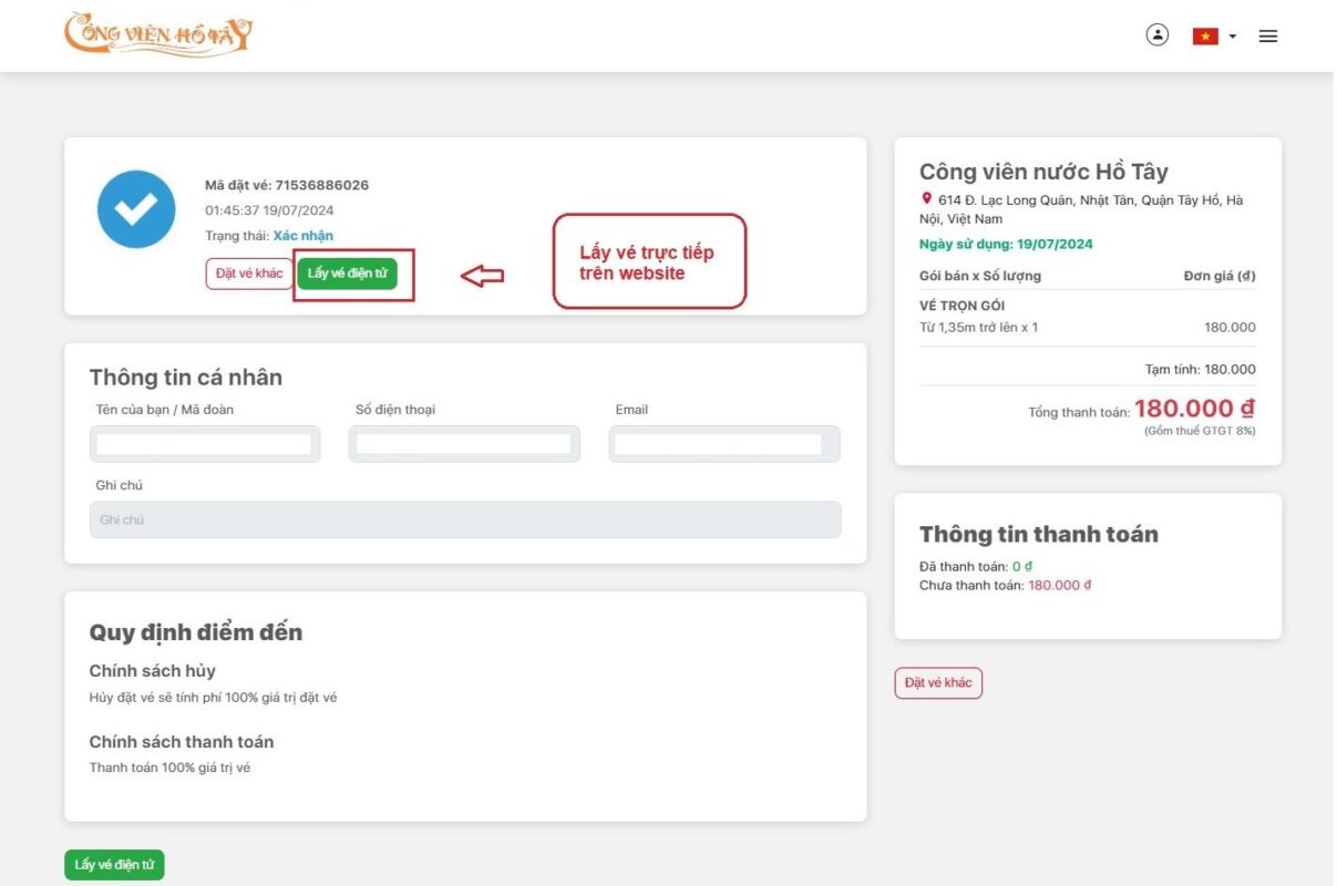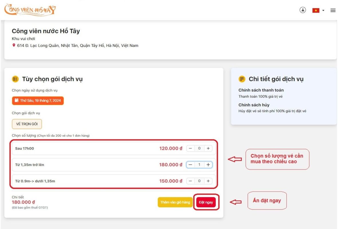 Hoặc truy cập vào “Đặt vé Online” trên web https://congvienhotay.vn/